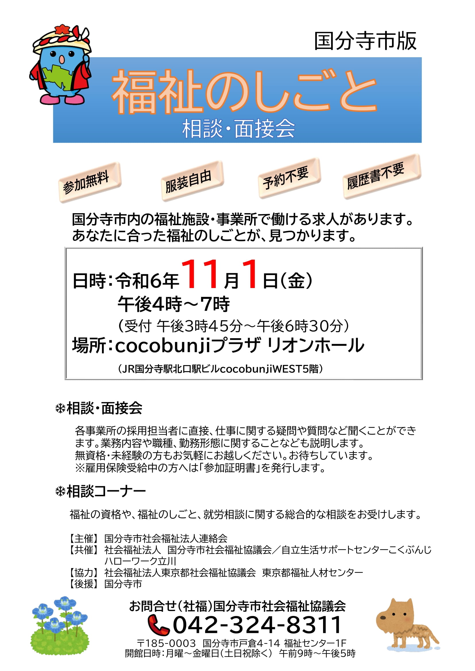 国分寺市社会福祉法人連絡会では、下記の日程で「福祉のしごと相談・面接会」を開催いたします。
